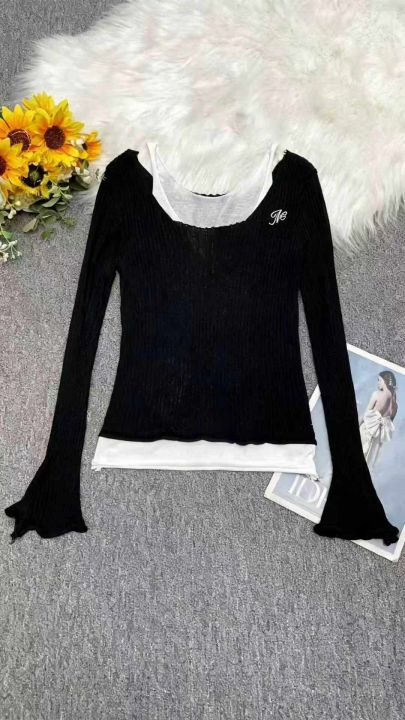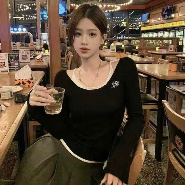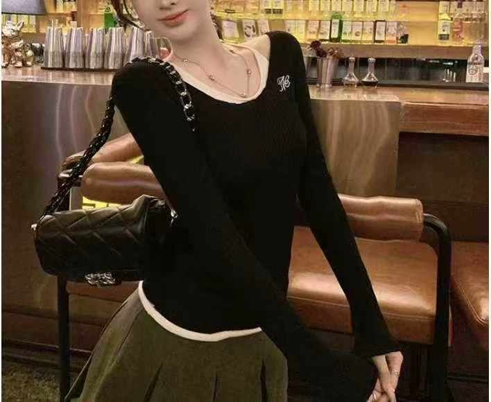 秋季新款假两件U领小众弹力修身显瘦刺绣长袖针织衫,...
