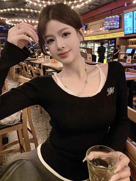秋季新款假两件U领小众弹力修身显瘦刺绣长袖针织衫,...