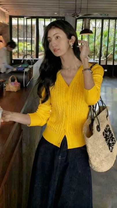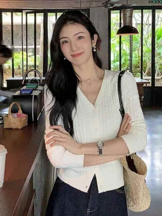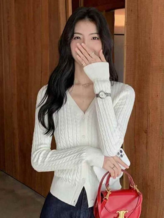 秋季新品麻花复古V领显瘦简约包芯纱毛衣开衫,独立包...