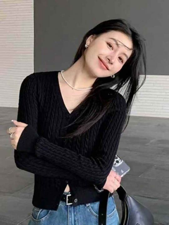 秋季新品麻花复古V领显瘦简约包芯纱毛衣开衫,独立包...