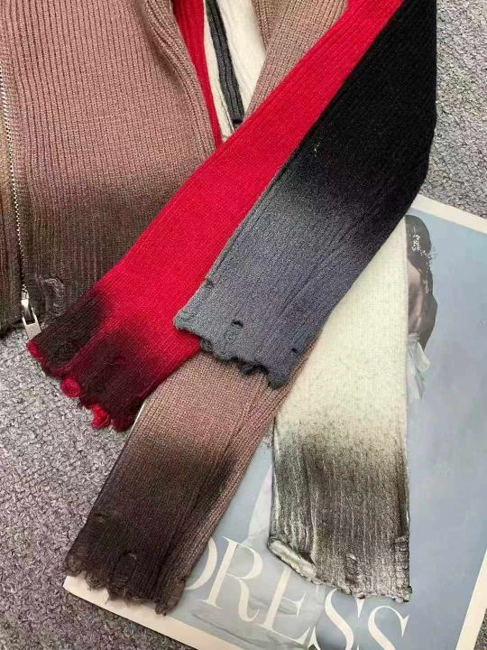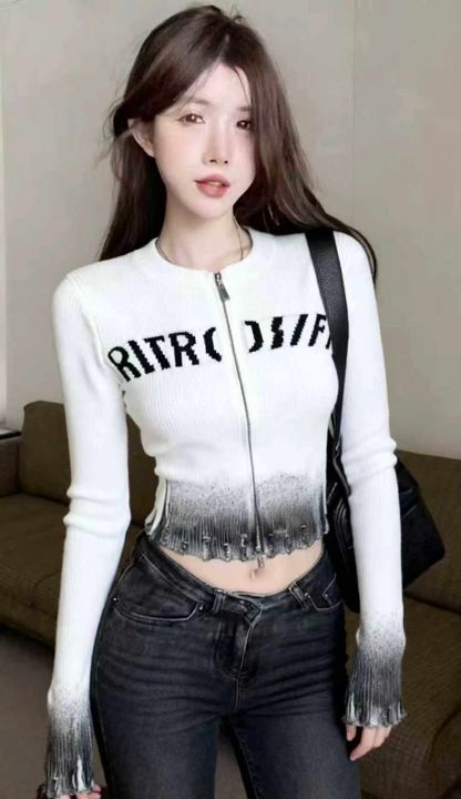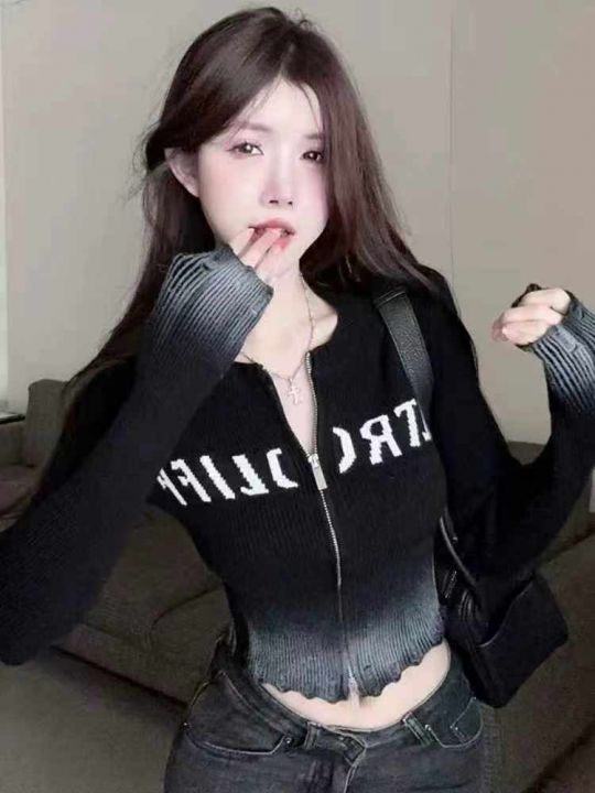 秋季新品纯欲风水磨印花设计感双头拉链针织毛衣开衫,...