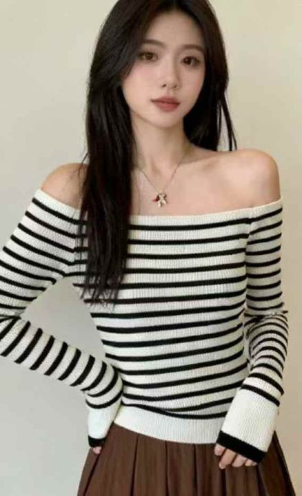 秋季新品法式条纹辣妹露肩一字肩高级感套头毛衣,独立包装,均码面料柔软舒...