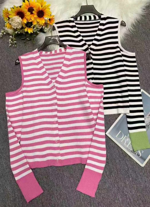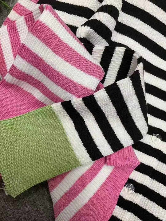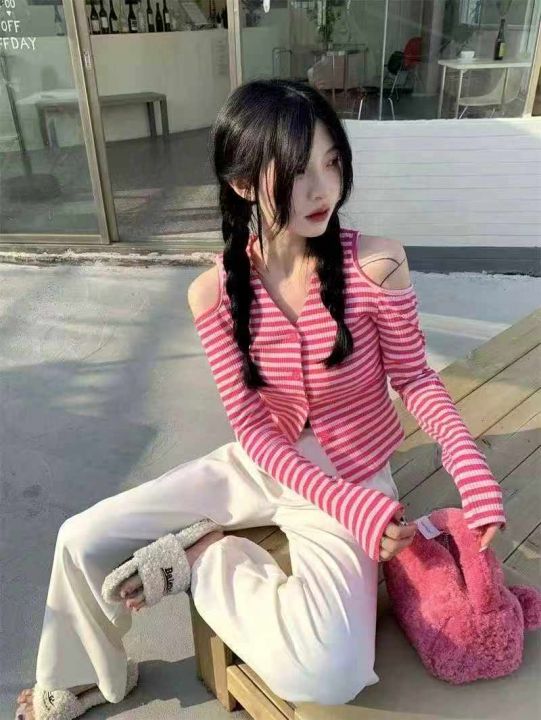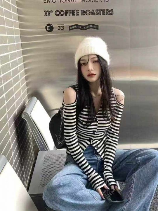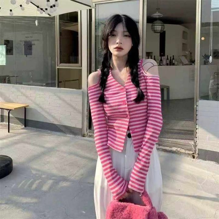 秋季新品纯欲风V领露肩小心机设计感条纹显瘦针织开衫...
