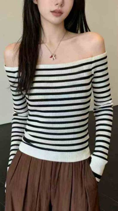 秋季新品法式条纹辣妹露肩一字肩高级感套头毛衣,独立...