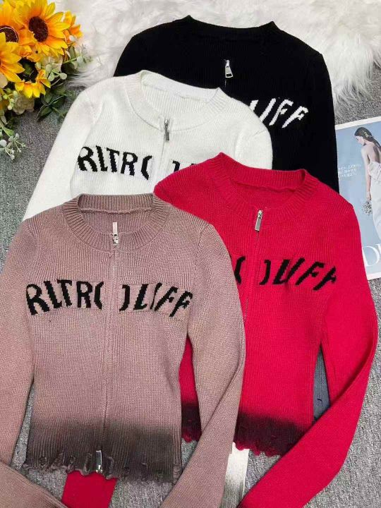 秋季新品纯欲风水磨印花设计感双头拉链针织毛衣开衫,...
