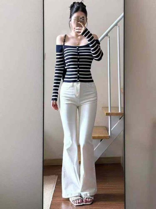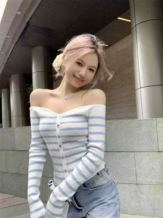 早秋新款韩系纯欲风辣妹条纹修身显瘦针织套头毛衣,独...