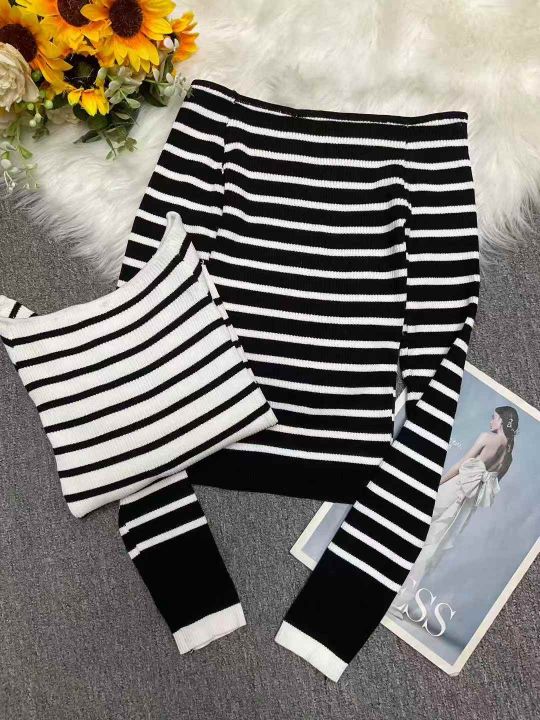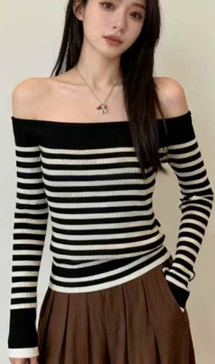秋季新品法式条纹辣妹露肩一字肩高级感套头毛衣,独立...