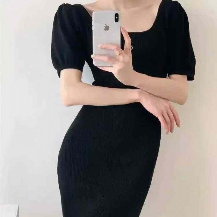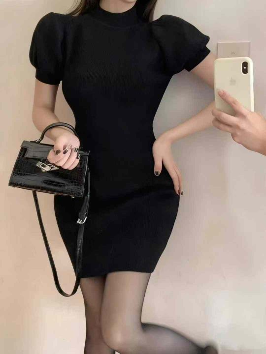 夏季新款法式减龄泡泡袖短袖弹力修身显瘦针织连衣裙,黑色多,独立包装,338件,全清6.9元超低价秒杀!