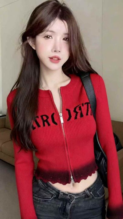 秋季新品纯欲风水磨印花设计感双头拉链针织毛衣开衫,...