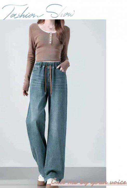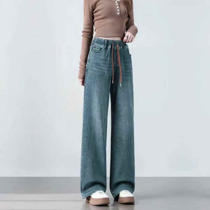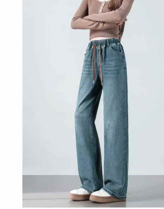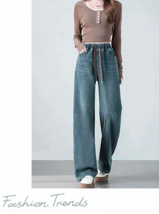 捡漏款,冬季新款宽松高腰松紧腰直筒阔腿加绒牛仔裤,...