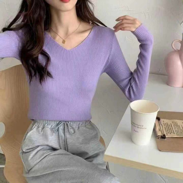 秋冬新款净版简约坑条包芯纱V领打底套头毛衣,独立包装,均码面料软糯舒适...