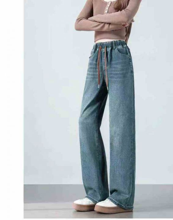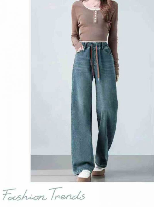 捡漏款,冬季新款宽松高腰松紧腰直筒阔腿加绒牛仔裤,...
