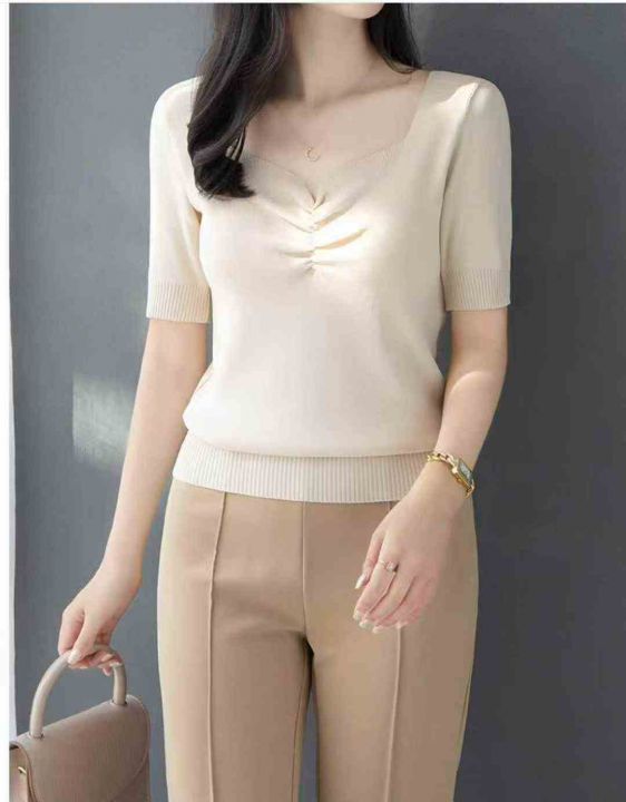 夏季新款温柔风宽松百搭冰丝复古V领针织T桖,独立包装...