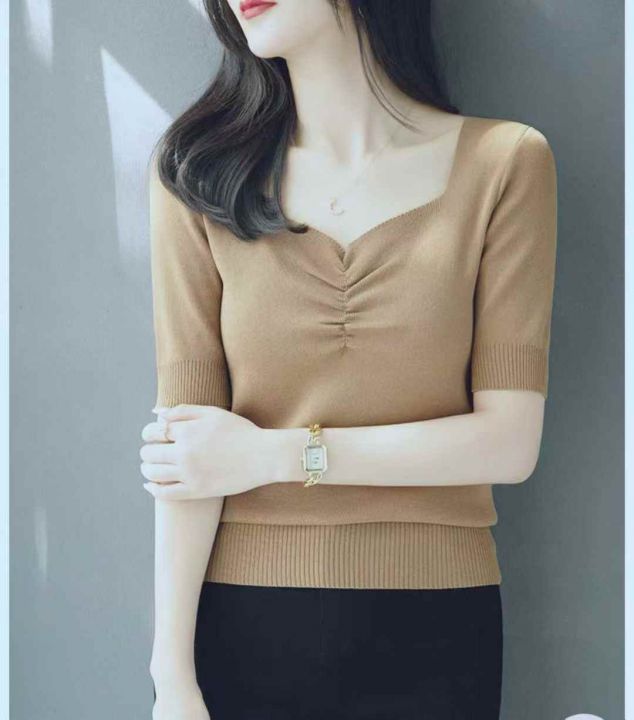 夏季新款温柔风宽松百搭冰丝复古V领针织T桖,独立包装...