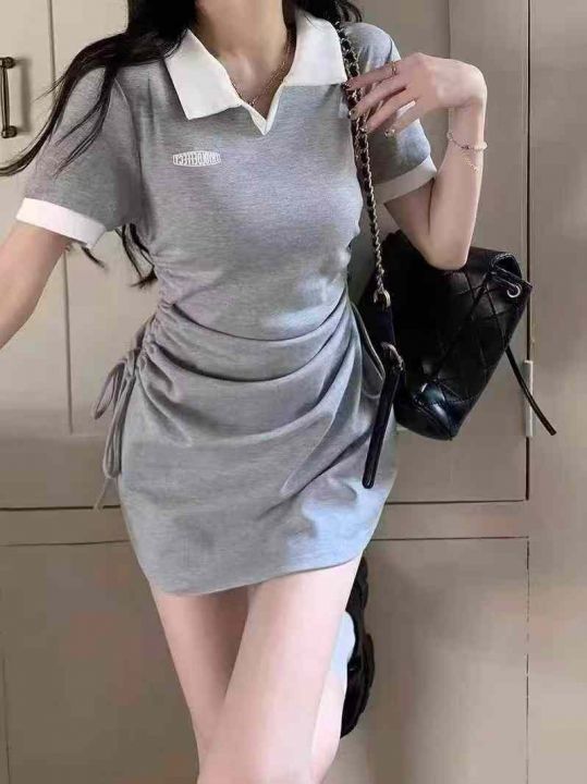 [月亮]:美式复古学院风两侧抽绳设计连衣裙