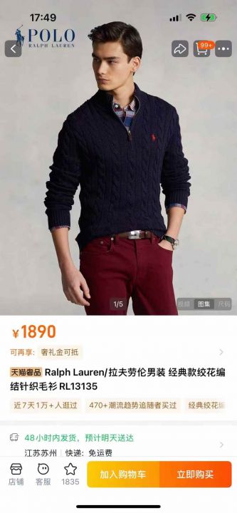 拉夫Polo半拉链套头毛衣1000多件。 货号:2978...
