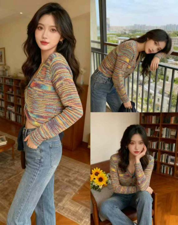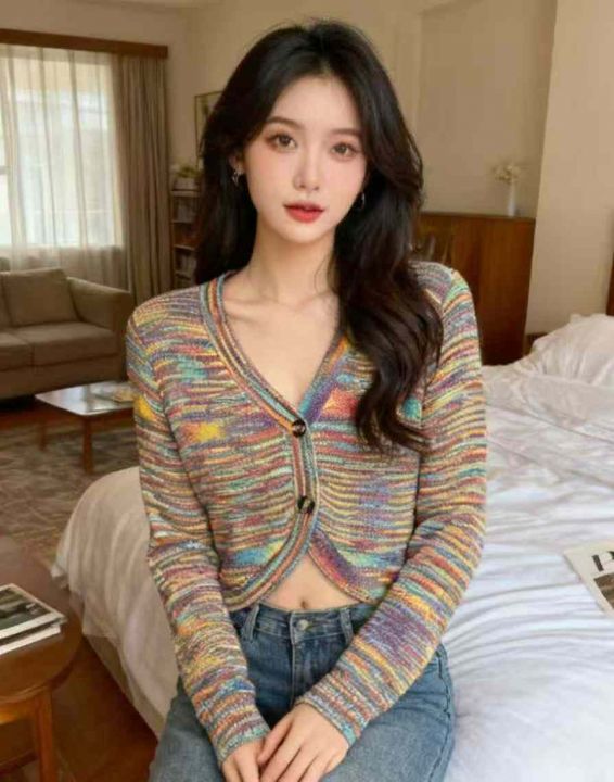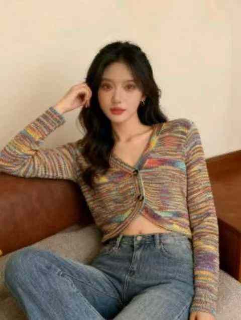 秋季新品宽松花纱撞色彩虹超好看针织毛衣毛衣开衫,独...