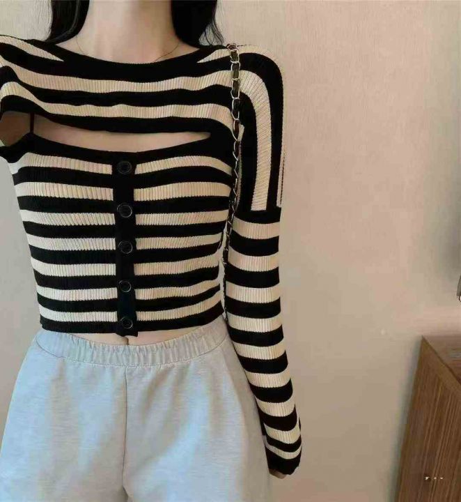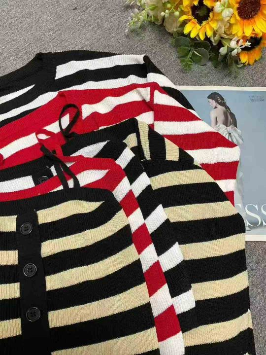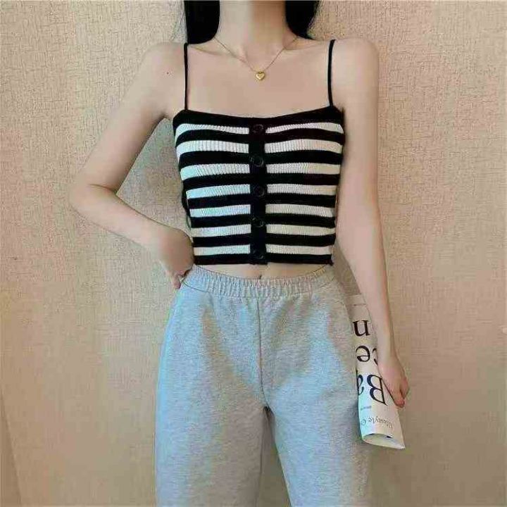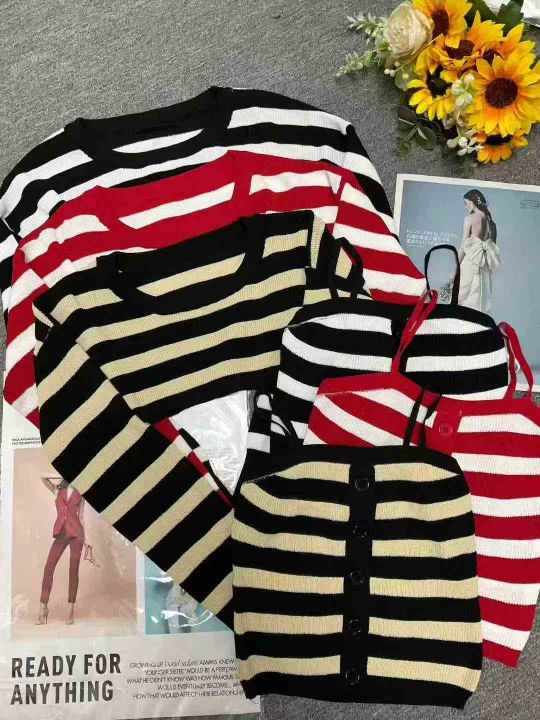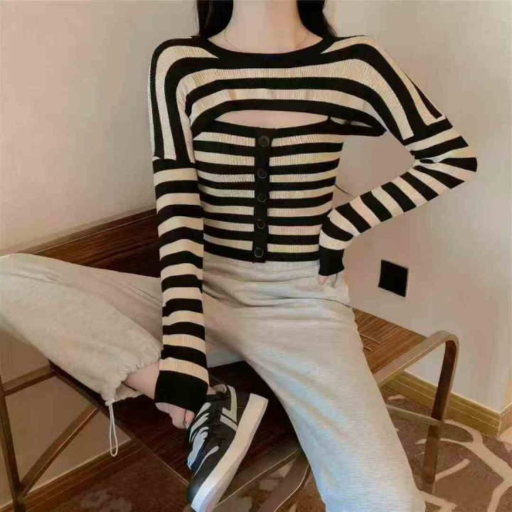 秋季新款撞色条纹软糯吊带背心+针织弹力修身上衣俩件...