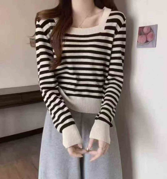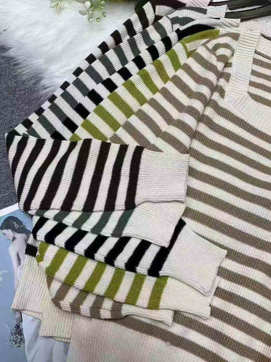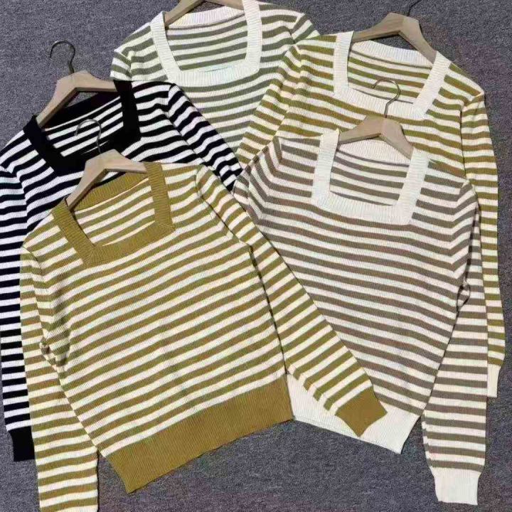 秋冬新款宽松撞色条纹针织方领套头毛衣,独立包装,均...