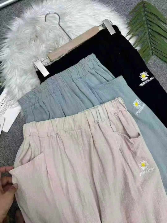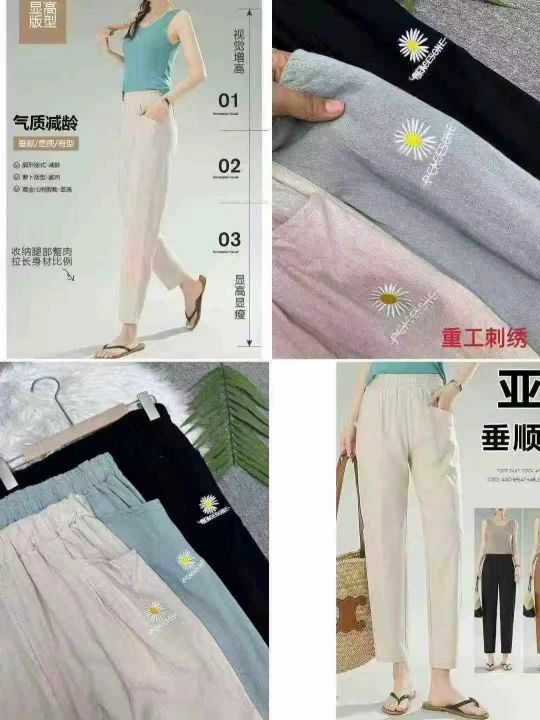 全清价7.5元捡漏309条刺绣菊花麻棉休闲修身女裤冰丝直...