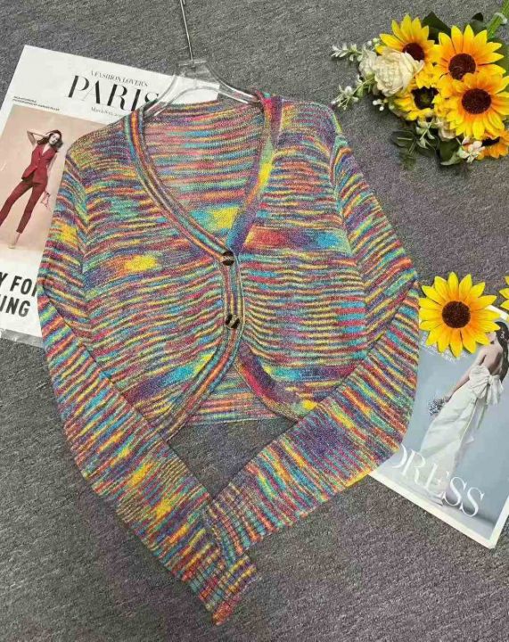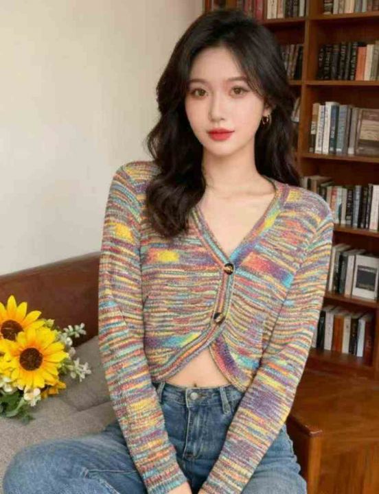 秋季新品宽松花纱撞色彩虹超好看针织毛衣毛衣开衫,独...