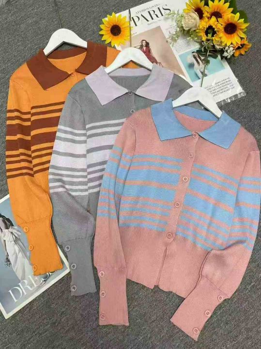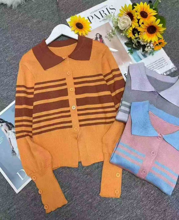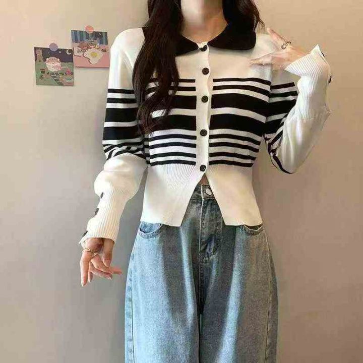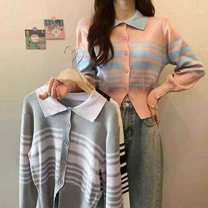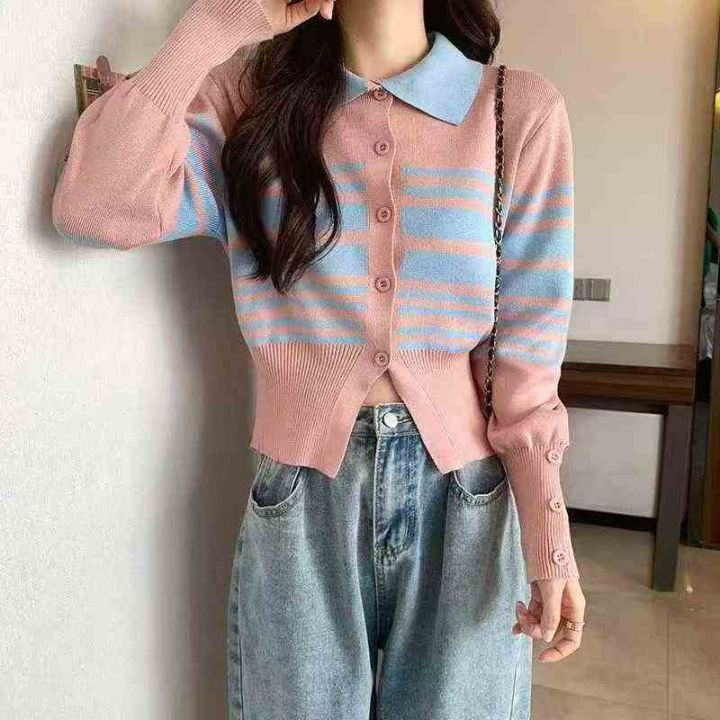 秋装新款设计感撞色洋气韩版polo领别致针织毛衣开衫,...