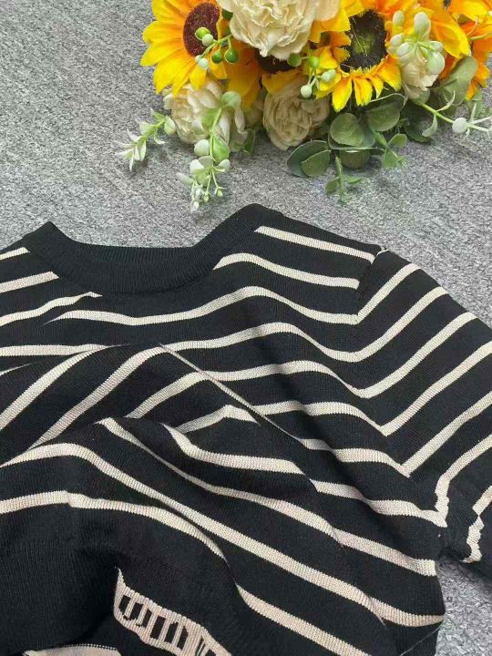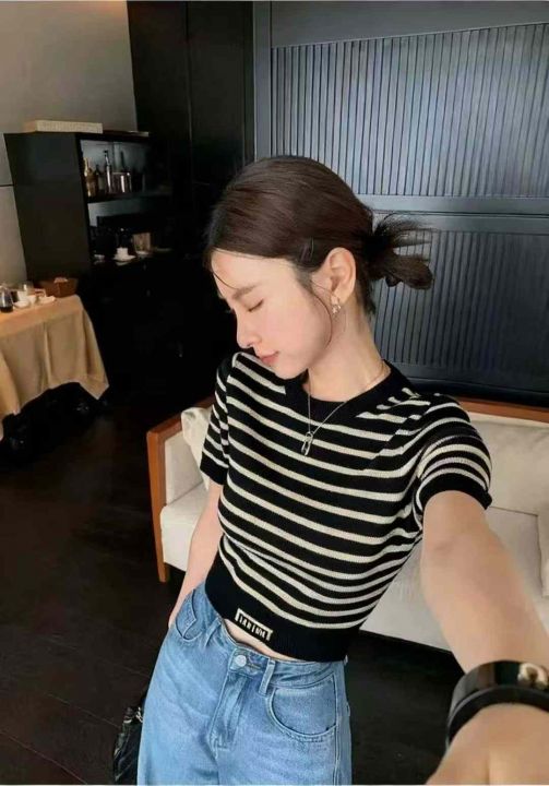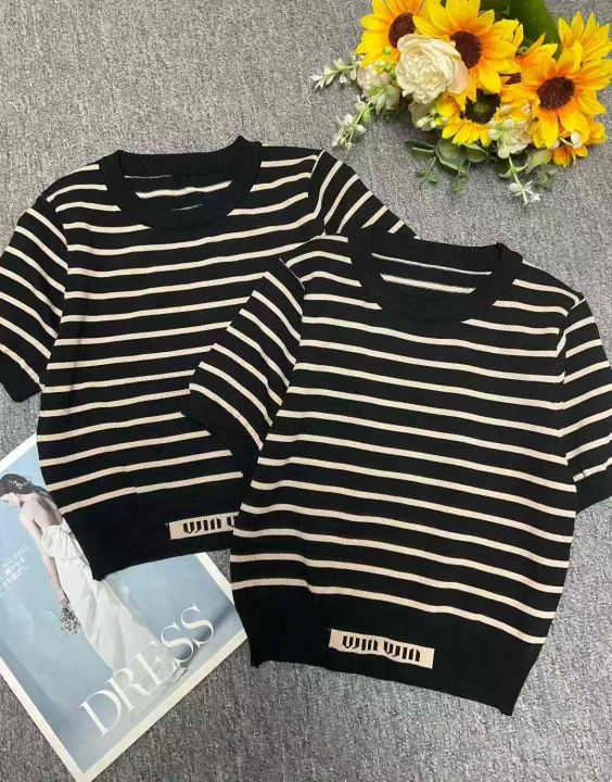 夏季新款独特别致洋气条纹短袖正肩针织t恤,独立包装...