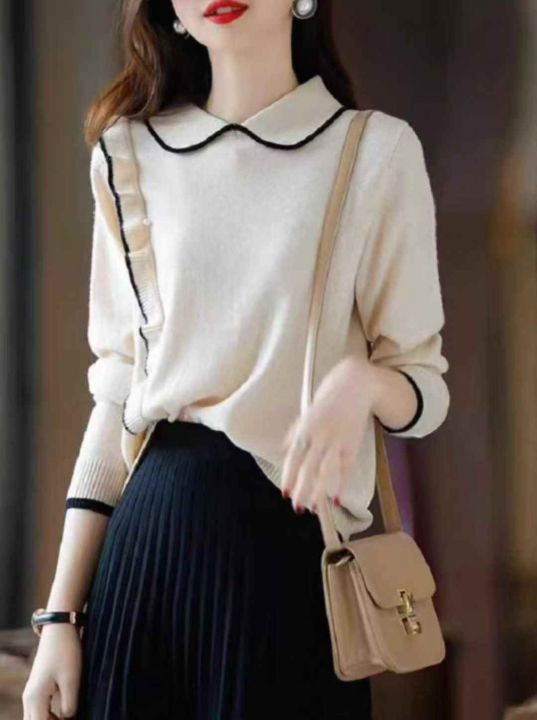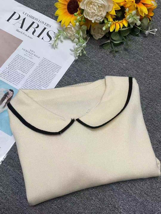 秋冬新款韩系温柔风撞色翻领长袖包芯纱套头毛衣,面料...