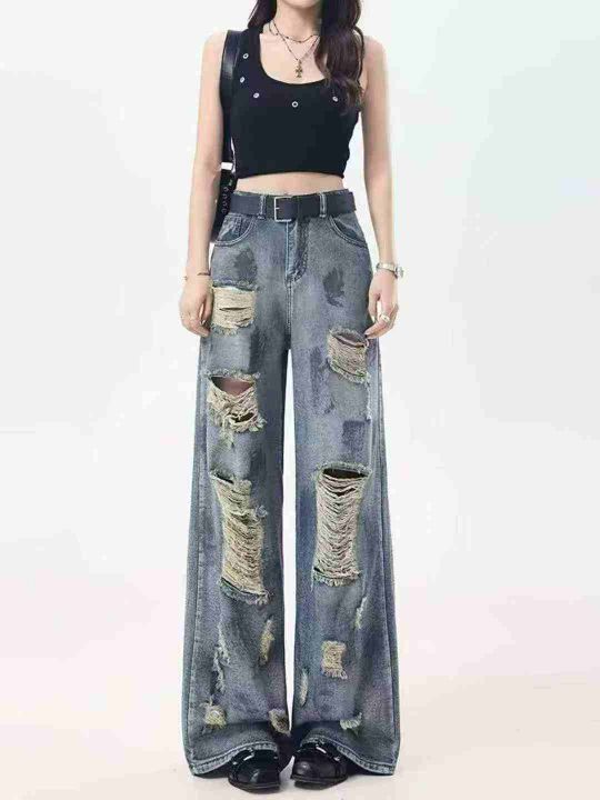 复古扎染废土风破洞女牛仔裤水洗垂感阔腿拖地裤,码数S-XXL,面料舒服柔软...