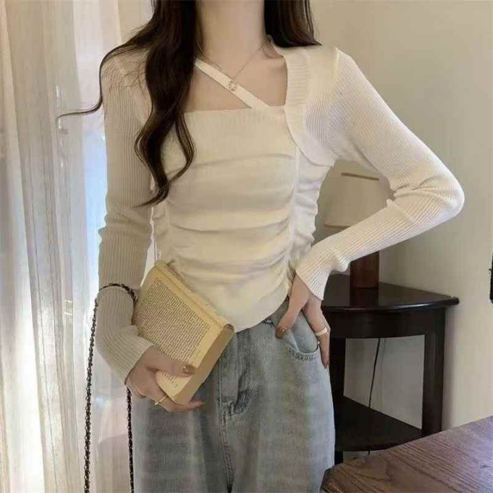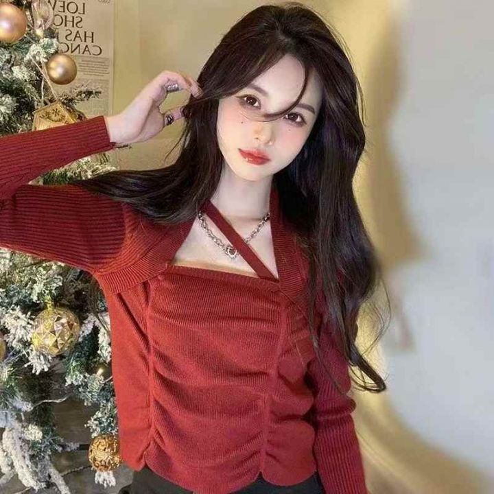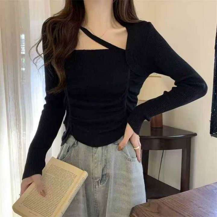 秋冬新款纯欲辣妹性感弹力修身显瘦设计款针织套头毛衣...
