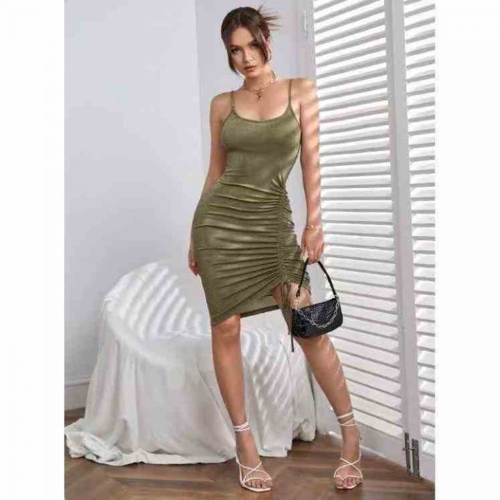 9.9清148件欧美性感潮流U字领无袖抽褶系绳不规则修身包臀吊带连衣裙 面料柔...