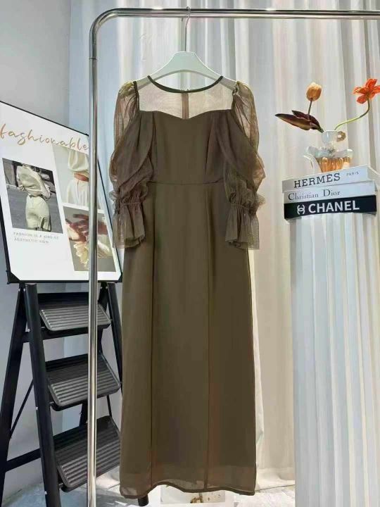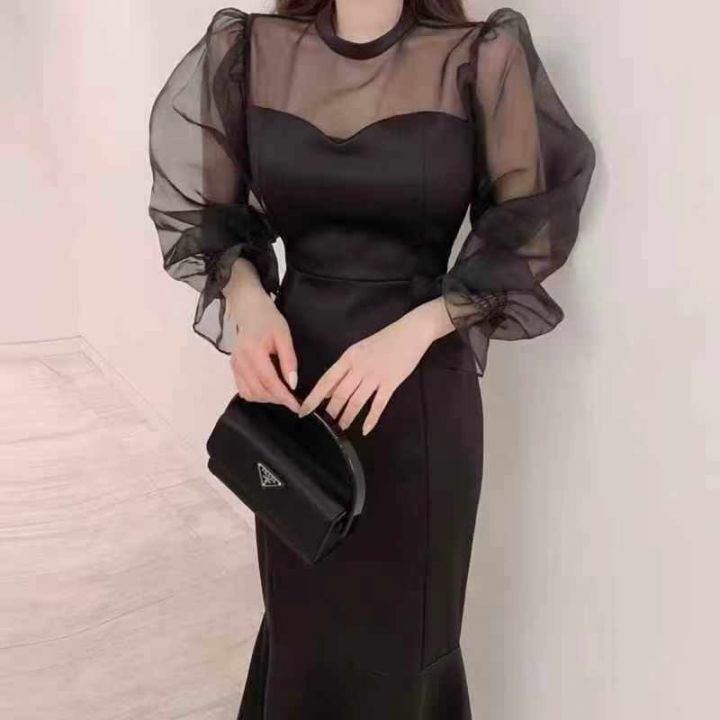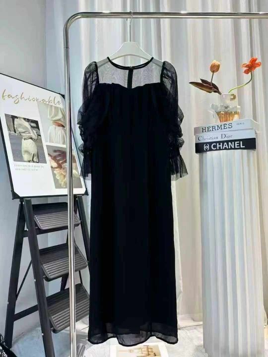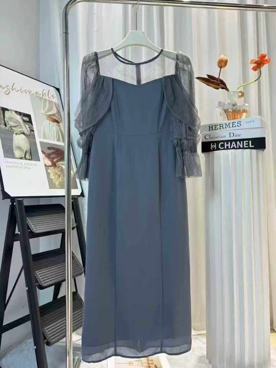 300条日单圆领拼接网纱微透喇叭袖收腰显瘦纯色开衩鱼尾连衣裙,质量超好!琉璃网纱微弹力不易勾丝,有内衬,尺码S-L,独立包装!全清17.8