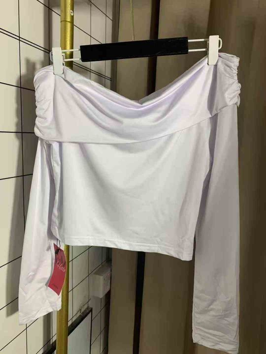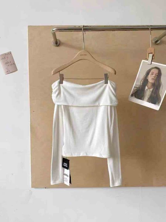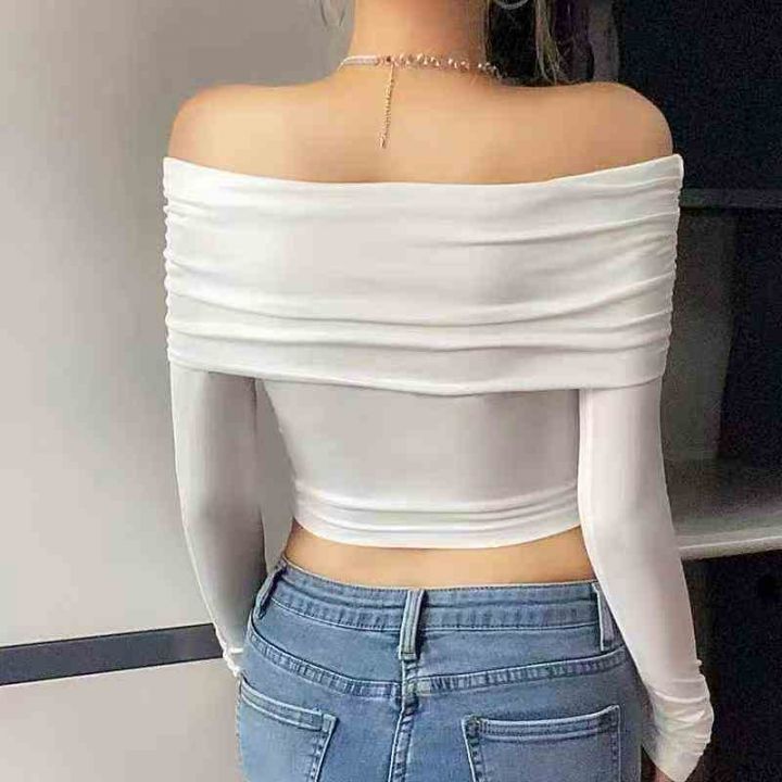 4.5清152件女靓妹辣妹性感一字肩褶皱长袖上衣女秋季短款修身显瘦气质百搭T恤 码数S-M-L 独立包装