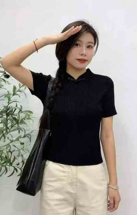夏季新款新中式立领中国风弹力修身显瘦针织短袖,独立包装,均码面料柔软舒...