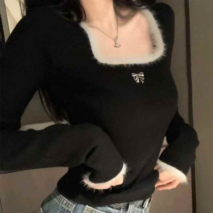 早秋新款小香风撞色刺绣减龄百搭拼接水貂毛设计款套头毛衣,独立包装,黑白...