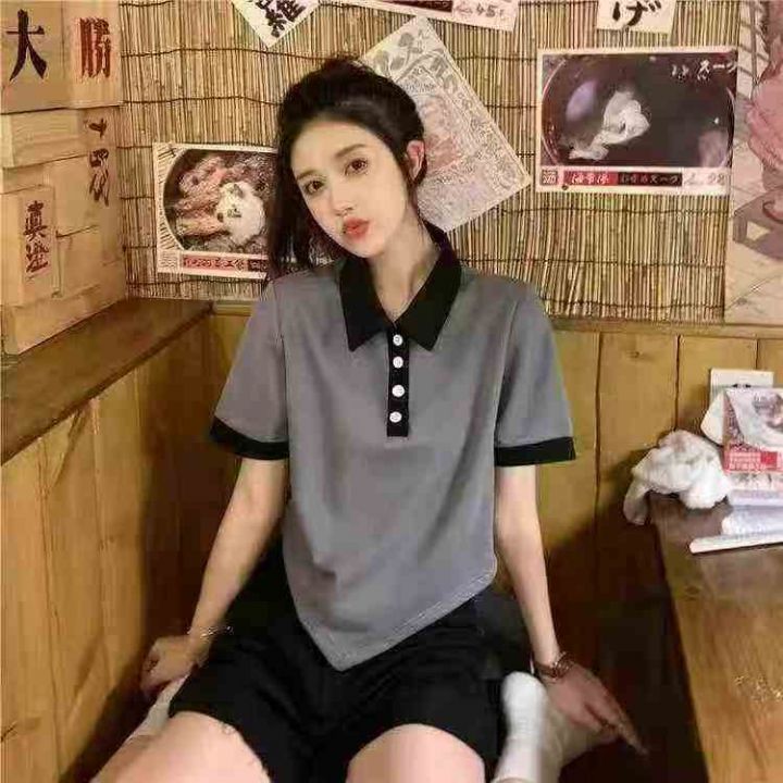 不规则polo领短袖T恤女夏季小个子短款显瘦女设计感甜...