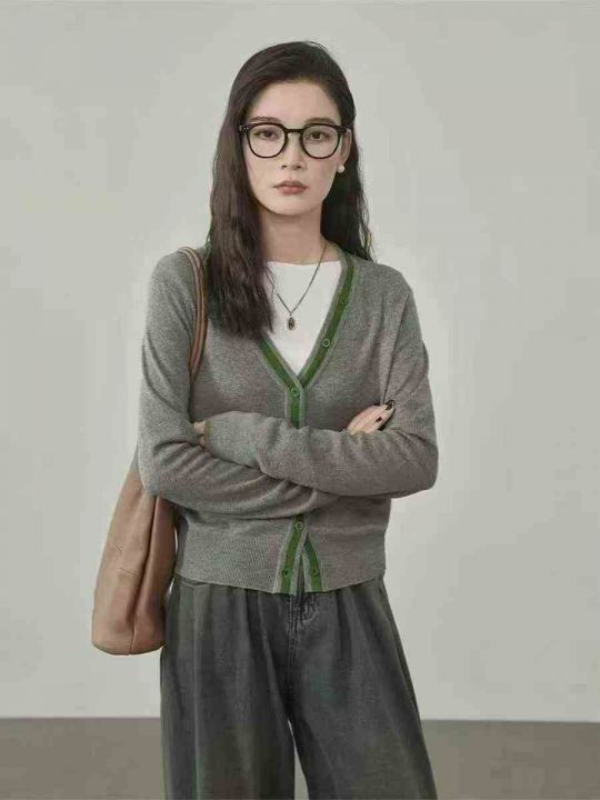 秋季条纹v领宽松小香风设计感遮肚显瘦长袖针织开衫,独立包装,均码面料柔...