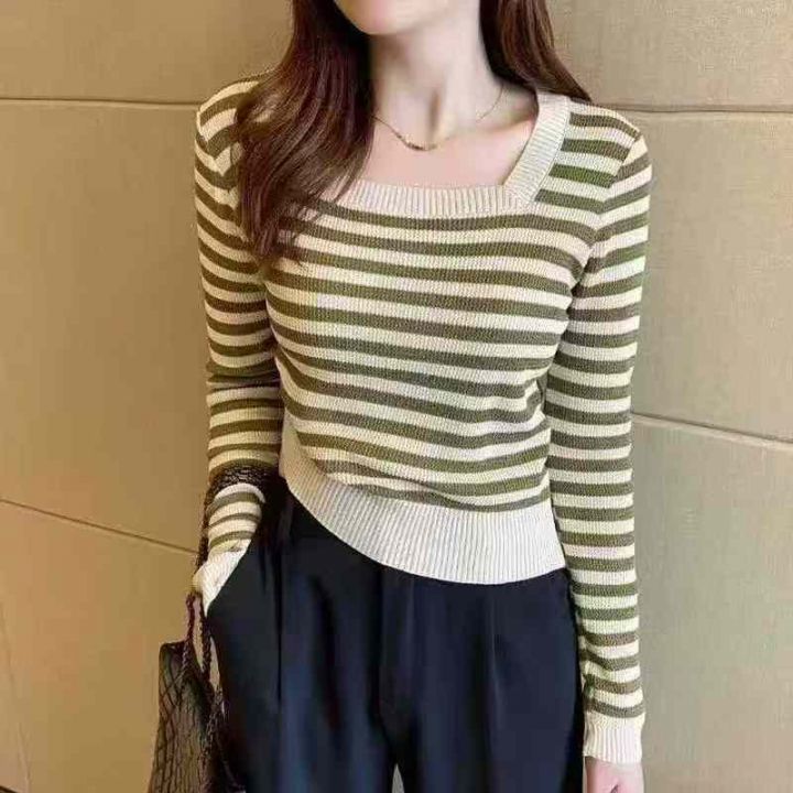 秋冬新款宽松撞色条纹针织方领套头毛衣,独立包装,均...