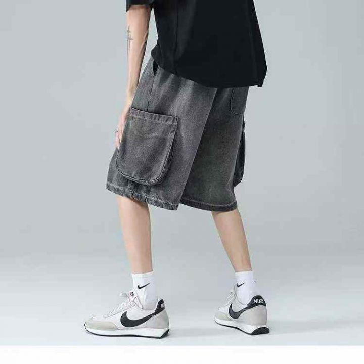 夏季新款松紧腰男士宽松百搭多袋洗水棉牛仔工装短裤,...