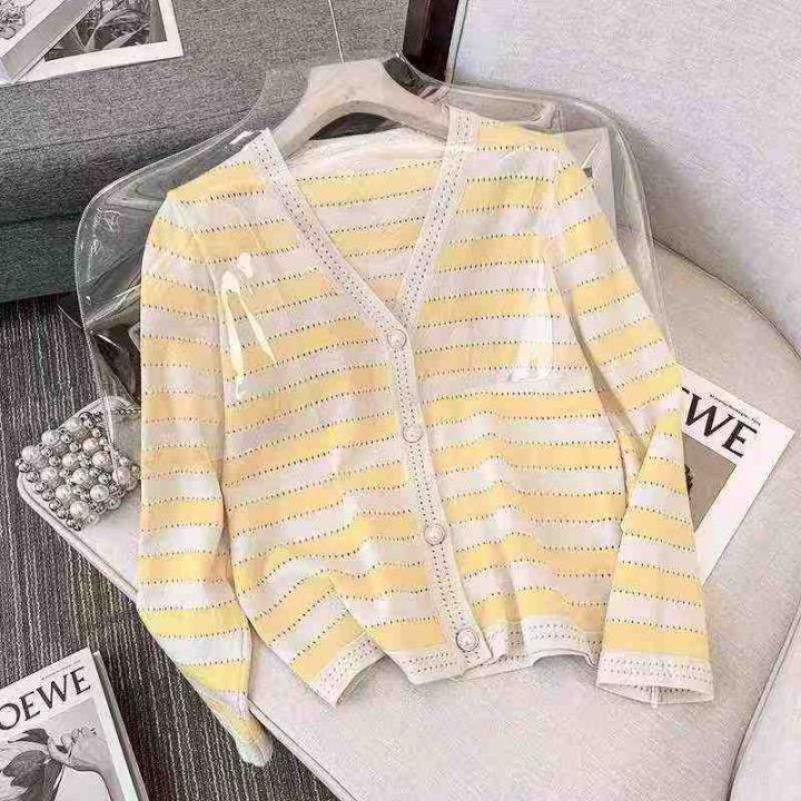 秋季条纹v领宽松小香风设计感遮肚显瘦长袖针织开衫,...