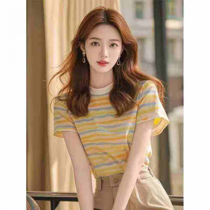 上新全清:5.8一件简约通勤ins设计感条纹圆领短袖,[爱心]260件左右,四个...