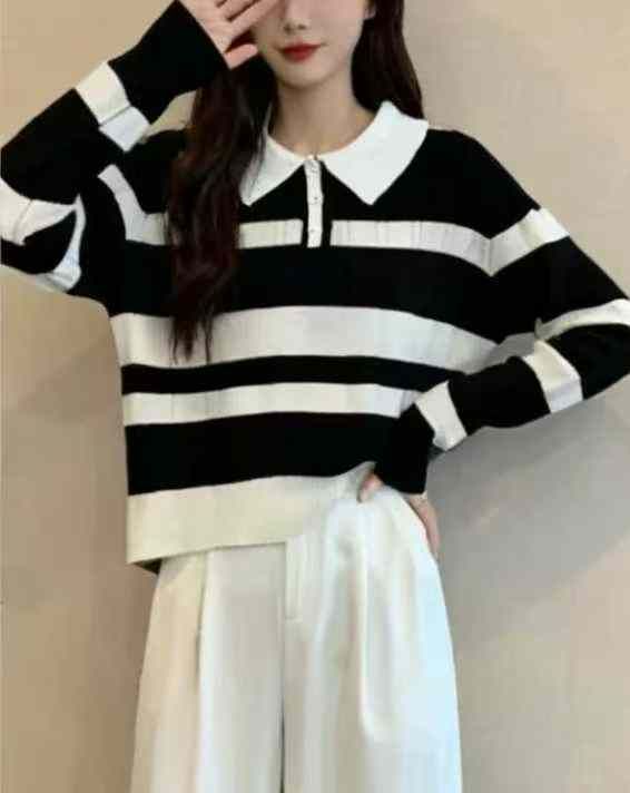 秋冬新款撞色条纹宽松Polo领套头毛衣,独立包装,均码...
