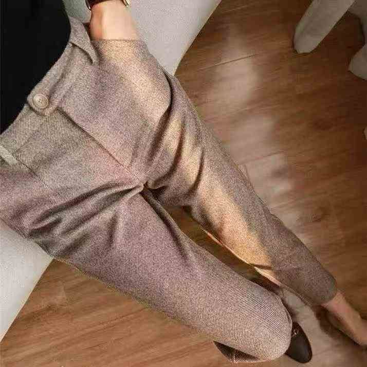 女裤2025秋冬棕咖色深灰色人字纹毛呢西裤女九分烟管裤...
