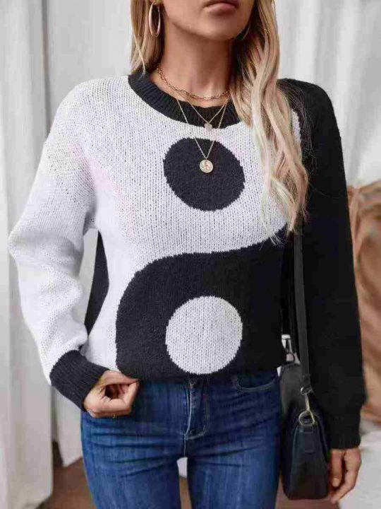 秋冬新款外贸跨境女式毛衣欧美宽松复古套头撞色毛衣,...
