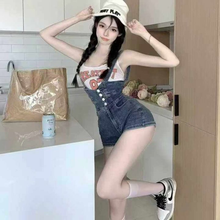 夏季新款靓妹女装弹力修身显瘦牛仔背带短裤,独立包装...