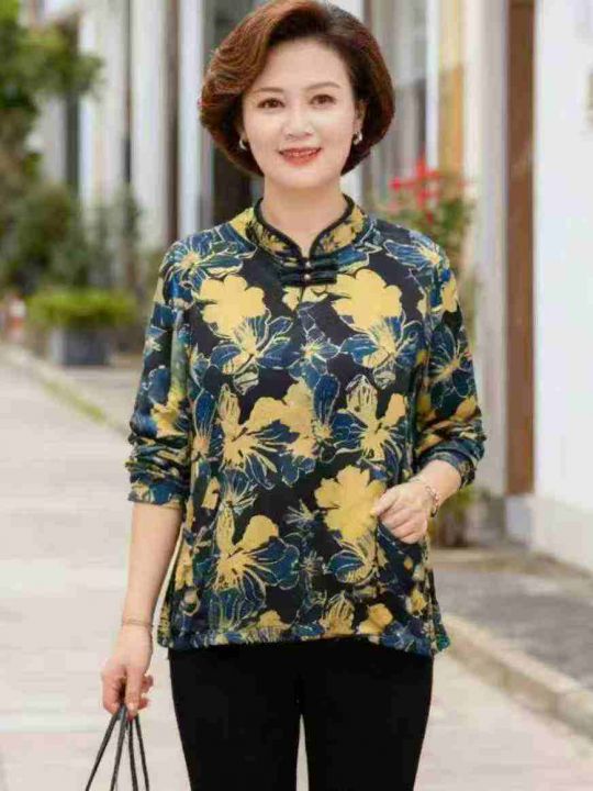 早秋新款时尚妈妈复古洋气民族风花色经典盘扣宽松长袖...