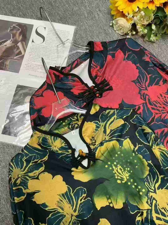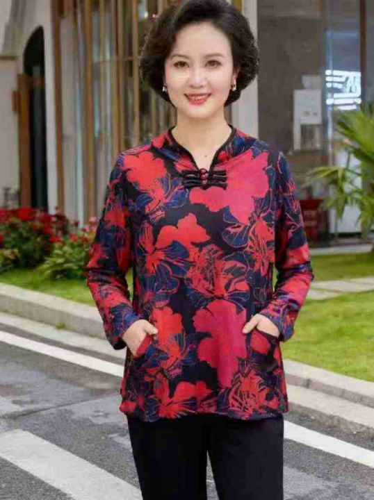 早秋新款时尚妈妈复古洋气民族风花色经典盘扣宽松长袖...