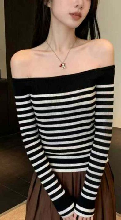 秋季新品法式条纹辣妹露肩一字肩高级感套头毛衣,独立...