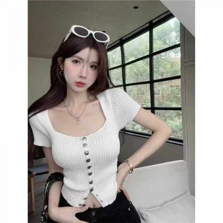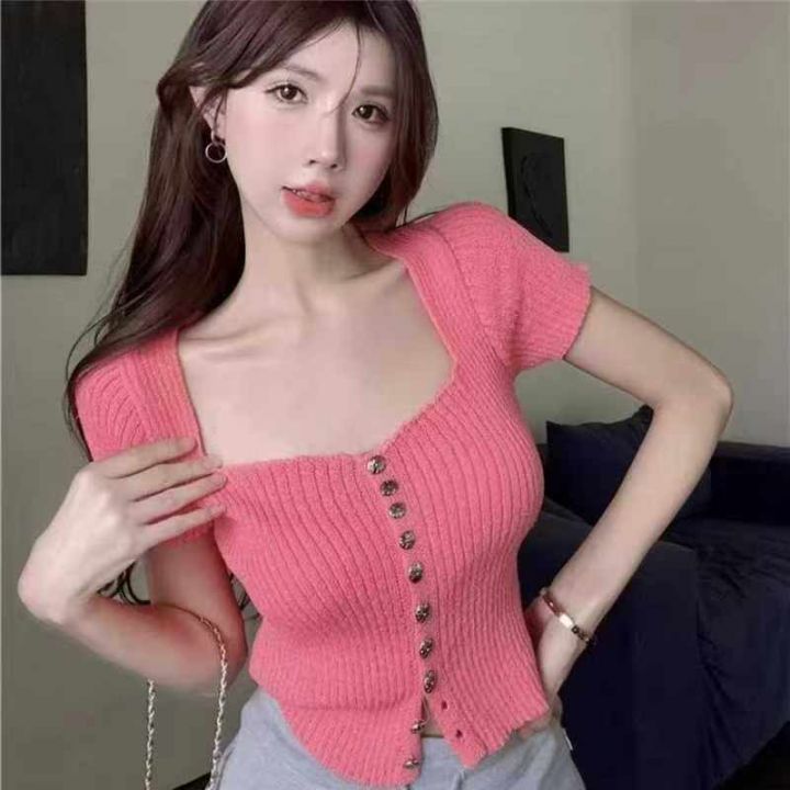 夏季新款纯欲甜辣妹设计感小众短款性感锁骨别致方领针织短袖开衫,独立包装,均码面料柔软舒适弹力大,788件,全清6.9元超低价秒杀!分货加一!