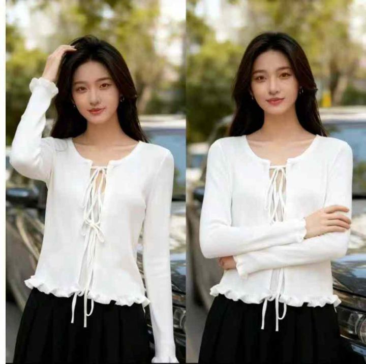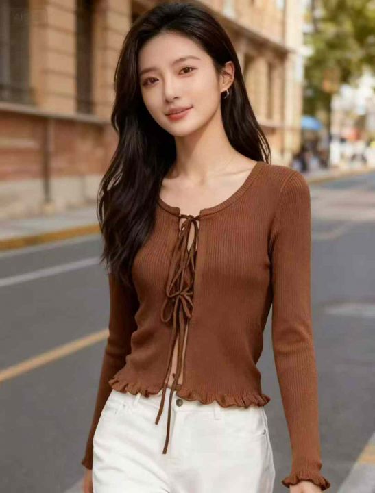 秋季新款韩系百搭宽松绑带花边针织毛衣开衫,独立包装...